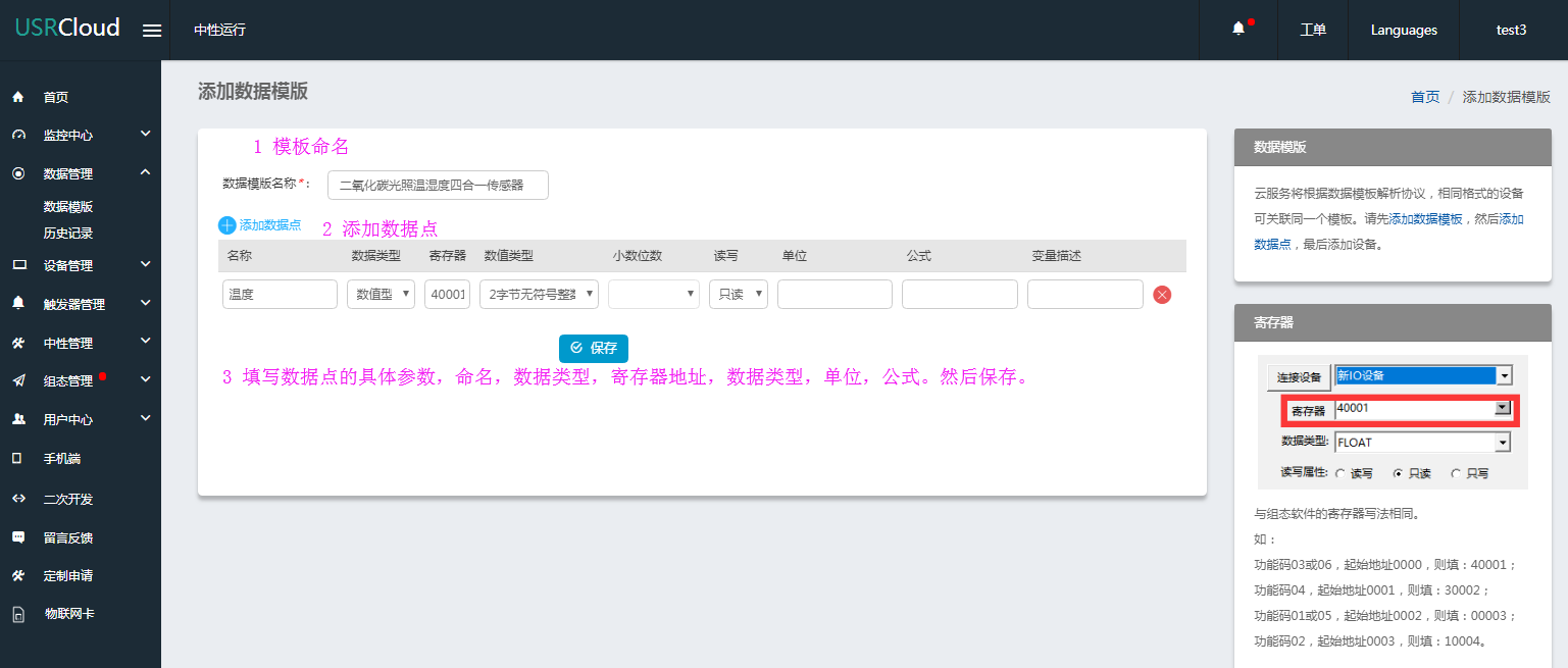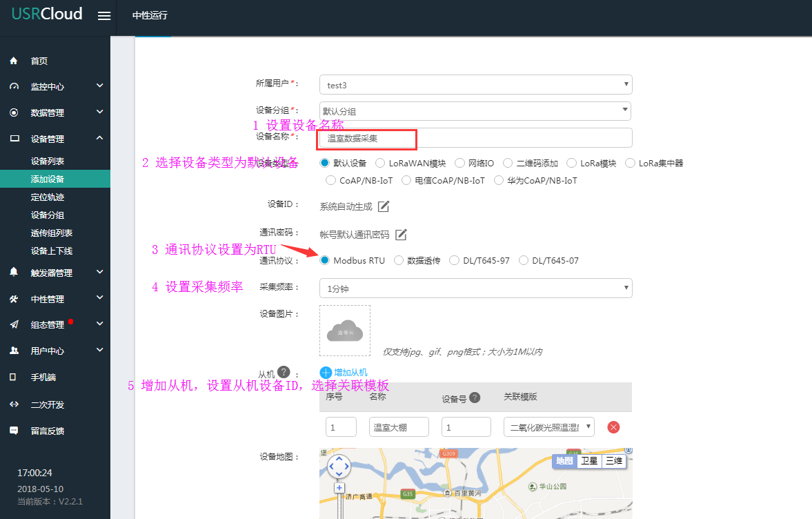 設(shè)備管理→添加設(shè)備→設(shè)備名稱→通訊協(xié)議→采集頻率→增加從機→保存