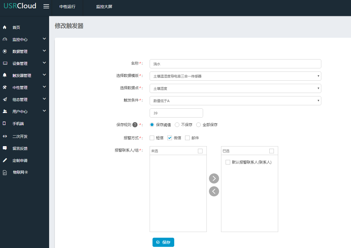 可以在透傳云內(nèi)添加報警觸發(fā)器,當(dāng)參數(shù)超過設(shè)置的值就發(fā)送報警信息給對應(yīng)的微信賬號,郵件或者短信。