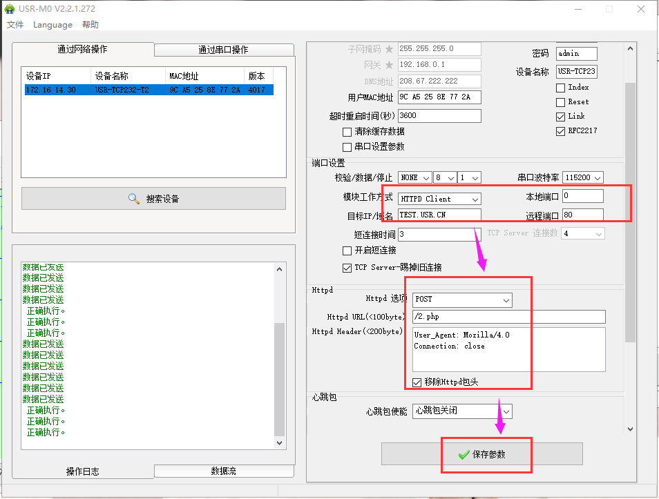 1.設(shè)置軟件設(shè)置,選擇httpd client 模式,HTTP服務(wù)器地址:test.usr.cn, HTTP服務(wù)器端口號為80,HTTP報頭路徑為/2.php,設(shè)置完成點擊保存設(shè)置。