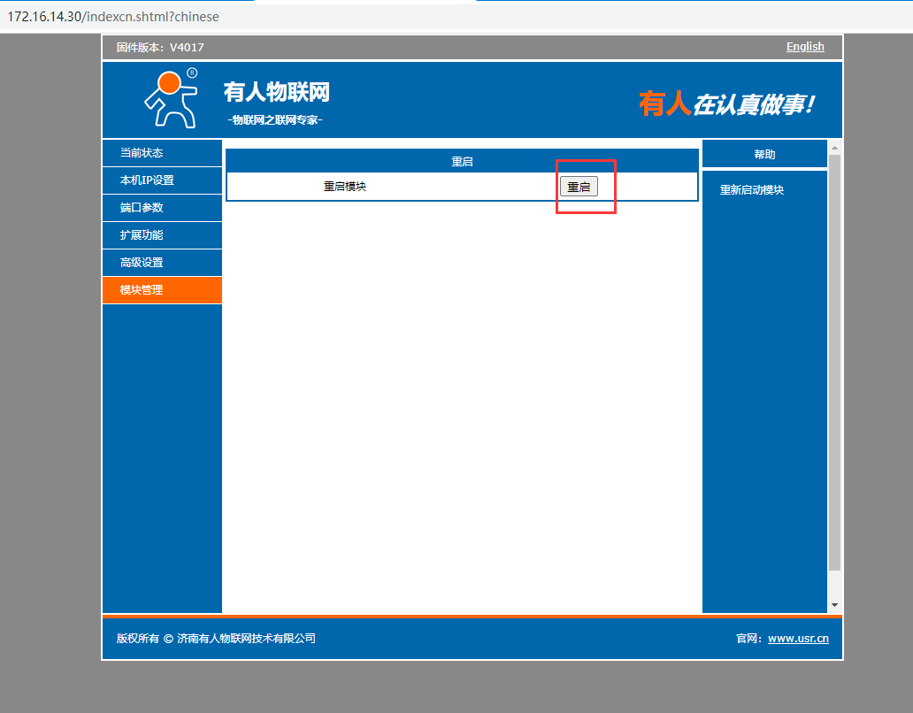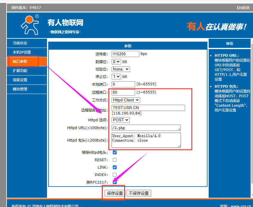 2.內(nèi)置網(wǎng)頁設(shè)置,根據(jù)M0搜索到動態(tài)獲取的IP地址進入內(nèi)置網(wǎng)頁。點擊httpd client 模式,HTTP服務(wù)器地址:test.usr.cn, HTTP服務(wù)器端口號為80,HTTP報頭路徑為/2.php?,設(shè)置完成點擊保存設(shè)置,在模塊管理點擊重啟生效。