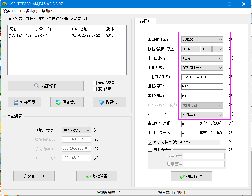 1.用M4設(shè)置軟件搜索K7的IP。出廠默認(rèn)是192.168.0.7,修改成DHCP/動(dòng)態(tài)ip,保存設(shè)置。