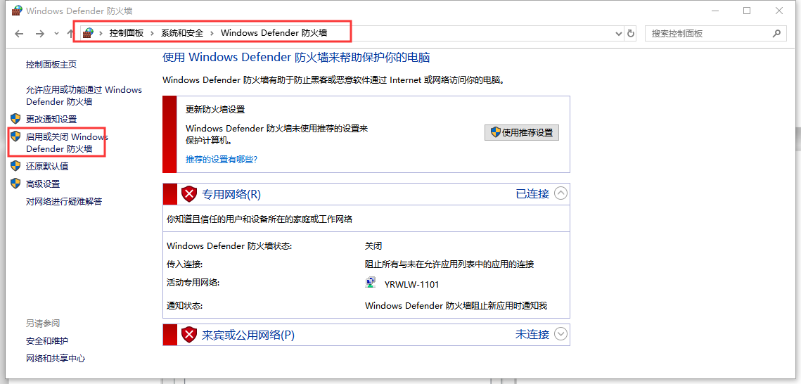 2.按路徑:控制面板》網(wǎng)絡(luò)和Internet》網(wǎng)絡(luò)和共享中心找到“windows防火墻”和“更改適配器設(shè)置”選項(xiàng),關(guān)閉防火墻并禁用與本次測(cè)試無關(guān)的網(wǎng)卡。并關(guān)閉電腦殺毒軟件