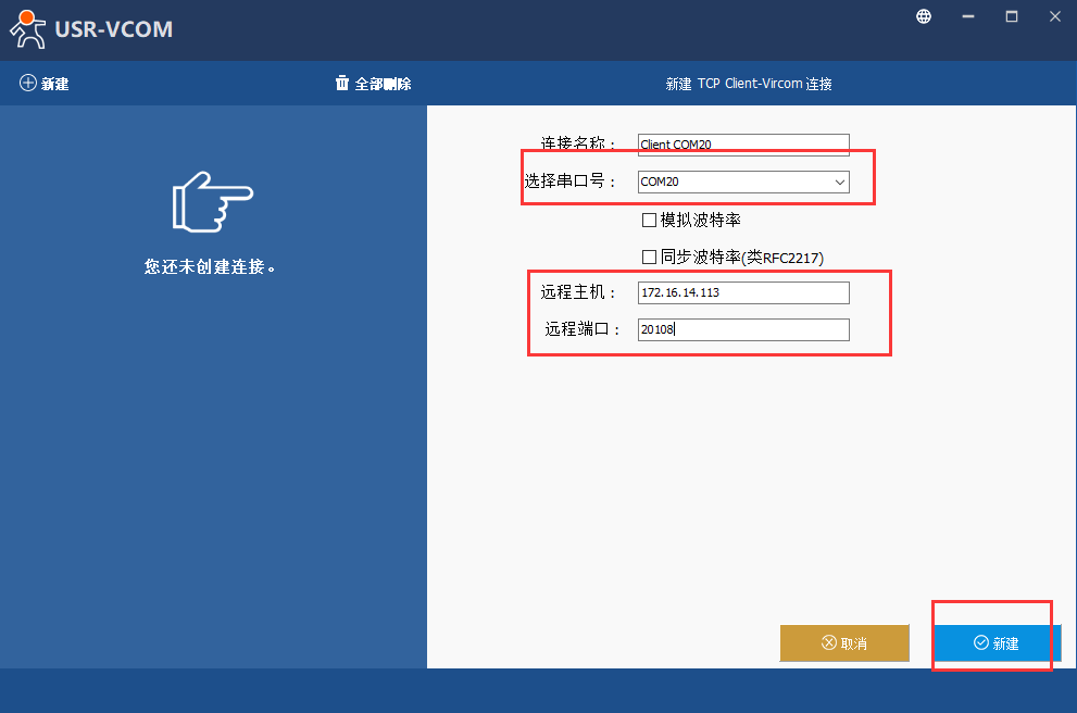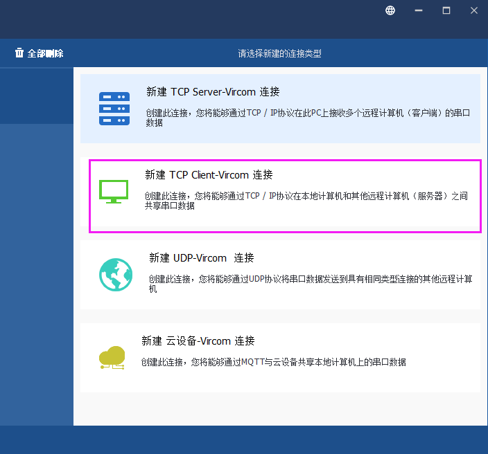 打開下載好的VCOM軟件,點(diǎn)擊新建TCP-Client-Vircom連接