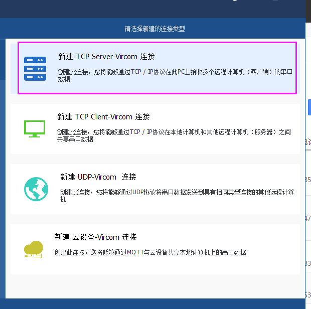 打開下載好的VCOM軟件,點(diǎn)擊新建TCP-Server-Vircom連接