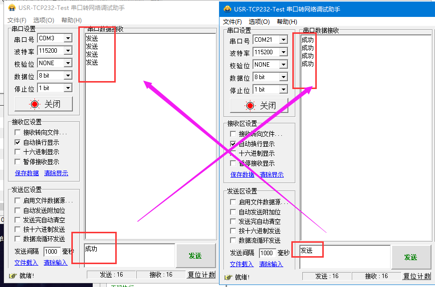同時(shí)打開兩個(gè)串口轉(zhuǎn)網(wǎng)絡(luò)助手軟件。一個(gè)選擇虛擬串口com21,一個(gè)選擇實(shí)際串口COM3,即可進(jìn)行收發(fā)測(cè)試