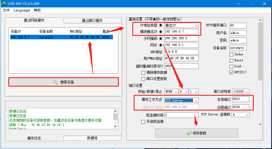 4、打開設(shè)置軟件,點擊“搜索設(shè)備”當搜索列表中出現(xiàn)K5的設(shè)備后,點擊搜索到的設(shè)備,模塊工作方式設(shè)為TCP SERVER,本地端口5523,點擊保存參數(shù)。