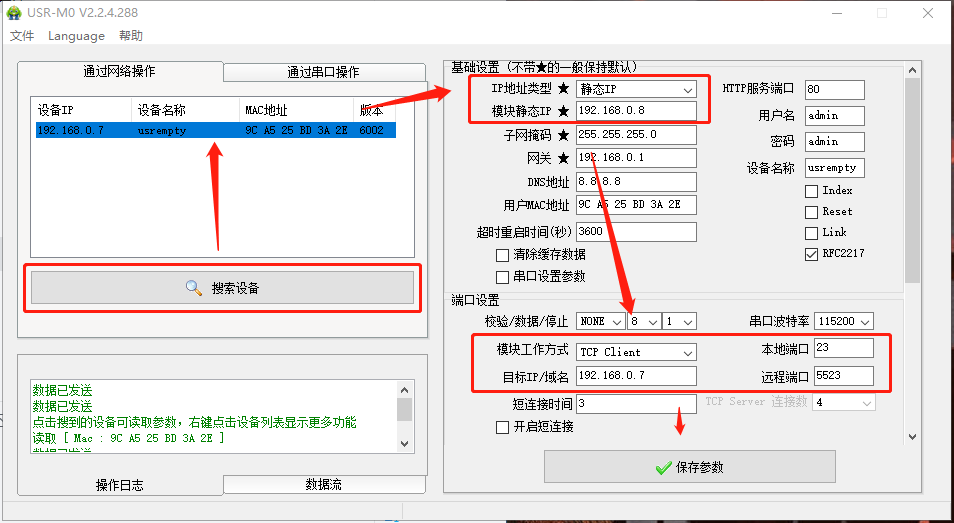 5、點擊“搜索設(shè)備”當搜索列表中出現(xiàn)另一臺K5的設(shè)備后,點擊搜索到的設(shè)備,為了防止IP沖突,將此設(shè)備IP修改為192.168.0.8,模塊工作方式設(shè)為TCP Client,本地端口0,遠程端口5523,點擊保存參數(shù)。