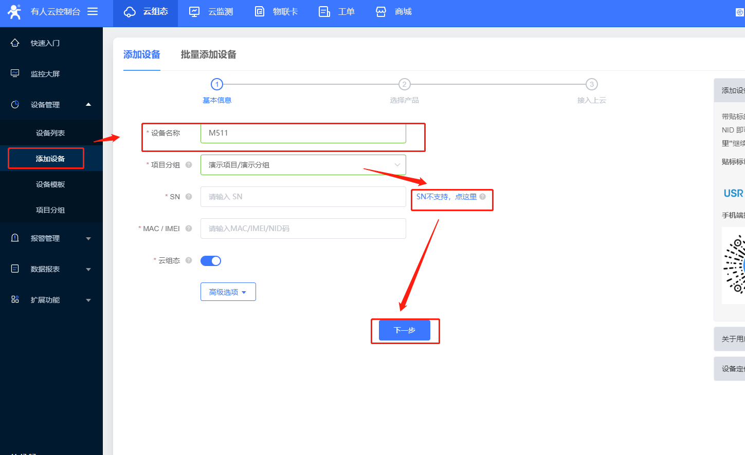 (2)M511不支持SN添加,點(diǎn)擊右側(cè)沒有SN,默認(rèn)自動生成設(shè)備編號和通信密碼