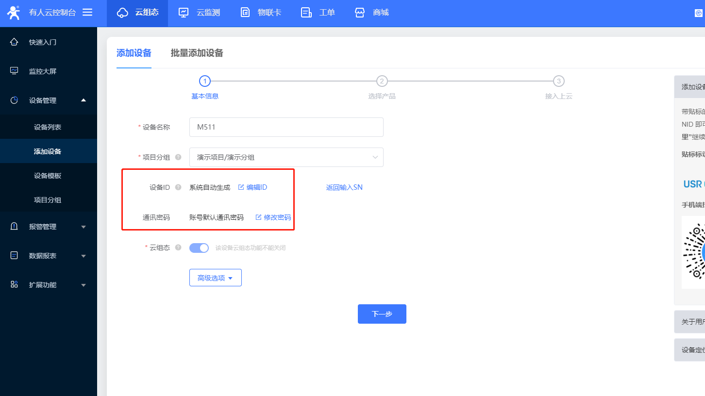 3.默認(rèn)生成SN和通信密碼,點(diǎn)擊下一步
