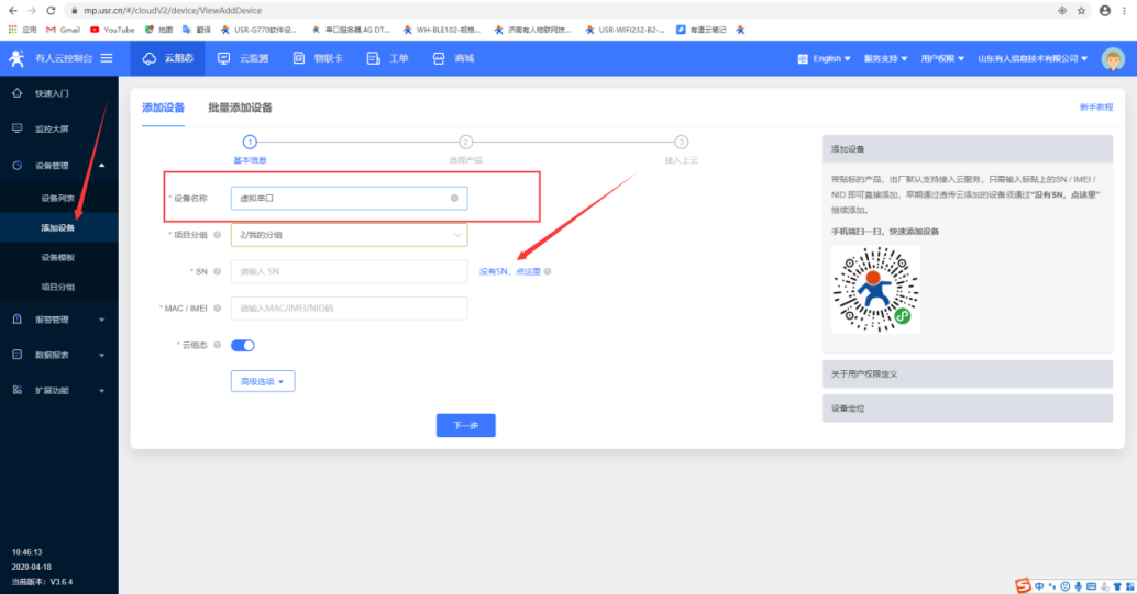 1.點(diǎn)擊添加設(shè)備,添加虛擬串口,點(diǎn)擊沒有SN,默認(rèn)生成設(shè)備編號和密碼