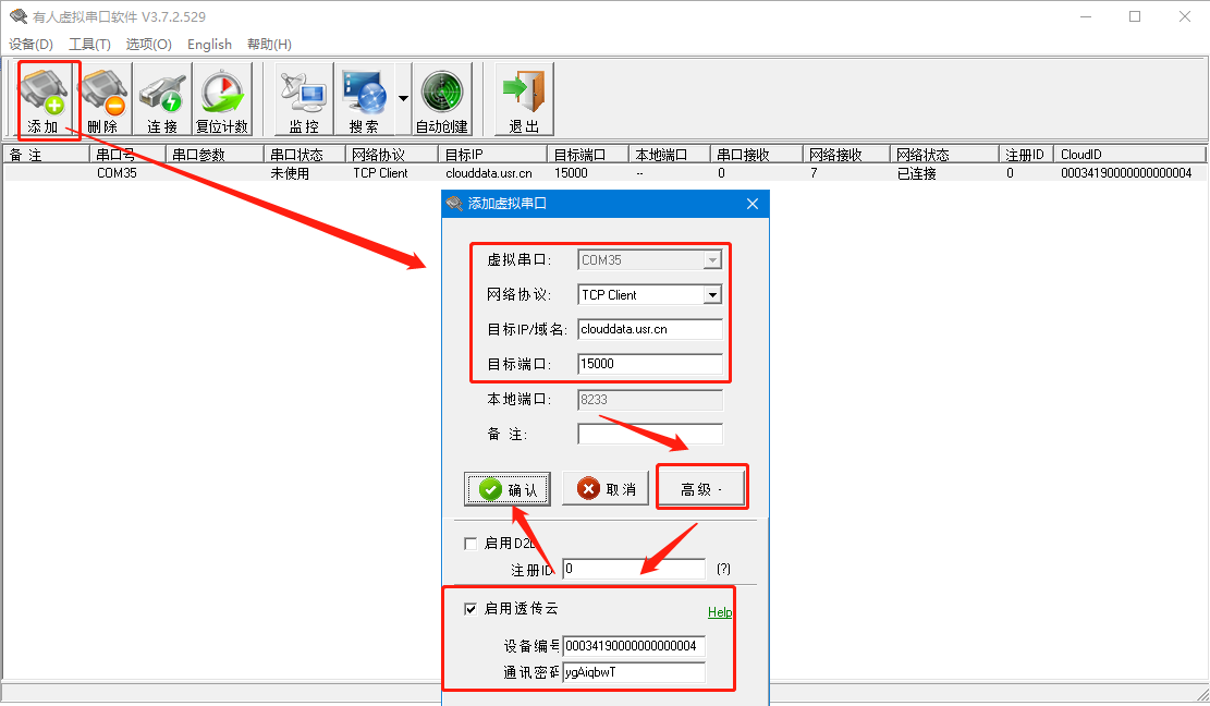 點(diǎn)擊高級,將云上生成的設(shè)備編號和密碼填入,點(diǎn)擊確定,生成虛擬串口