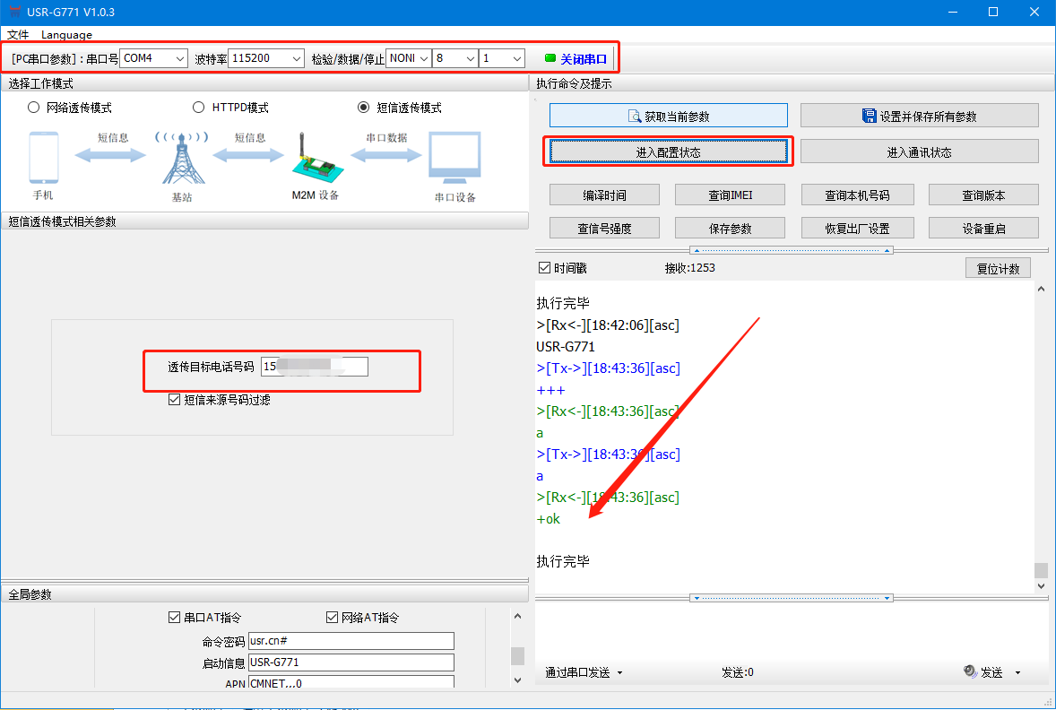 (2)打開串口——進(jìn)入配置狀態(tài)——設(shè)置工作模式為短信透傳,設(shè)置目標(biāo)手機(jī)號(hào)——設(shè)置并保存所有參數(shù)——串口打印開機(jī)信息說明設(shè)備重啟成功