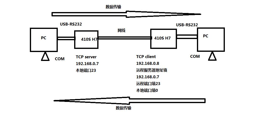 USR-TCP232-410S H7產(chǎn)品,DB9公頭接DB9母頭對母頭轉(zhuǎn)接線,轉(zhuǎn)接線接USB-RS232 DB9公頭,USB頭插入電腦USB口。410S網(wǎng)口通過網(wǎng)線直連電腦網(wǎng)口。檢查所有連接無誤后,給410S用12V電源適配器供電。分別設(shè)置參數(shù),設(shè)置完參數(shù),兩個(gè)410S網(wǎng)線直連。