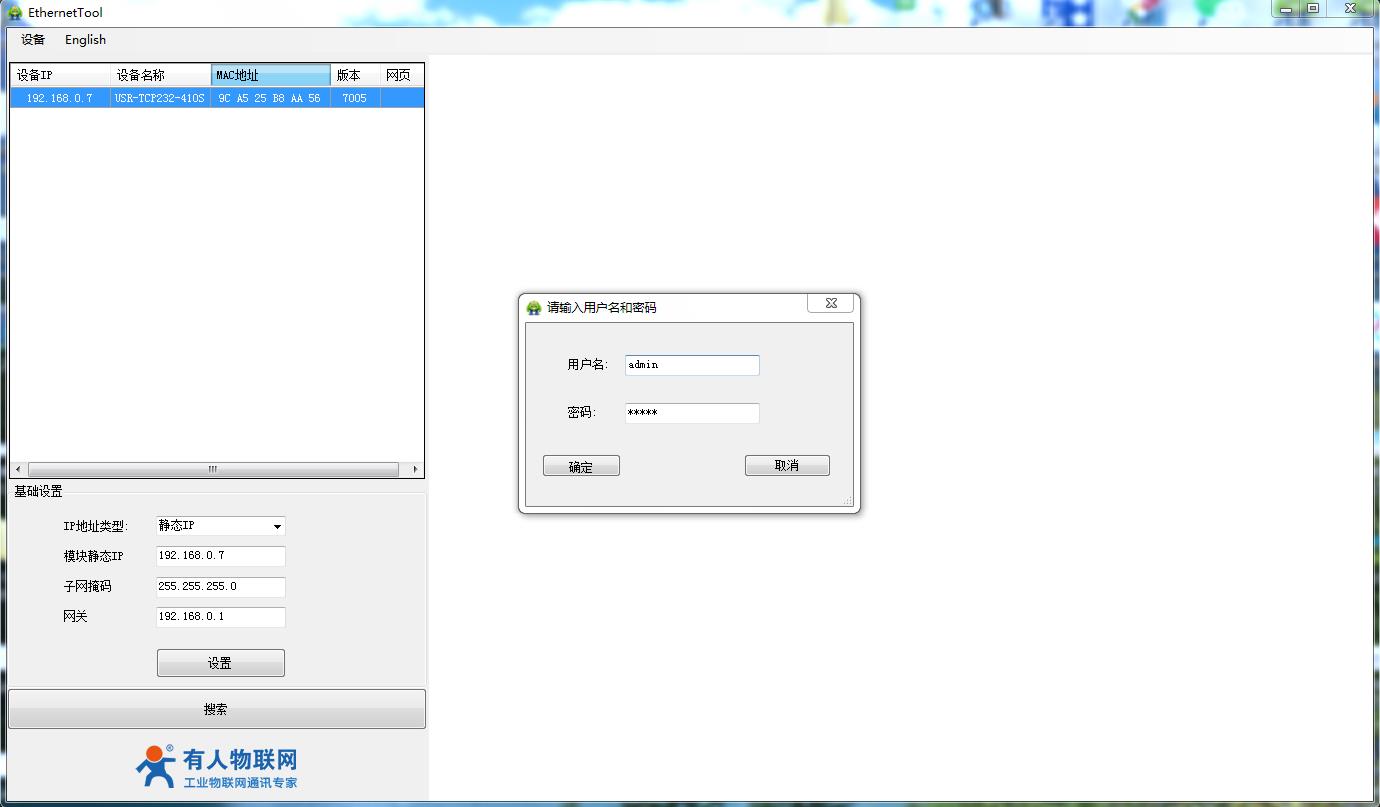 用H7系列配置軟件搜索410S設(shè)備,搜索IP 192.168.0.7之后,點(diǎn)擊IP,會彈出登錄框。