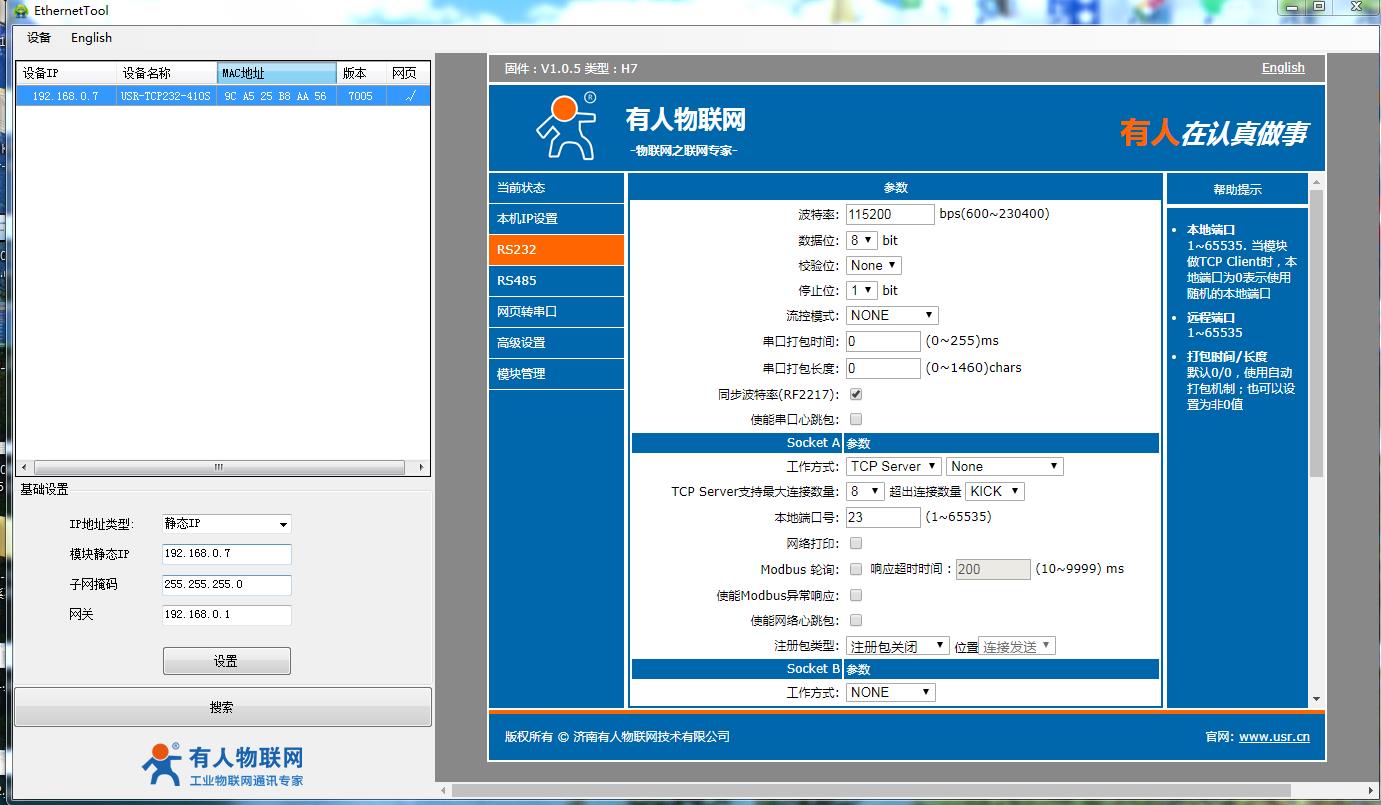 其中第1個(gè)410S IP設(shè)置192.168.0.7,RS232串口參數(shù)設(shè)置TCP server,本地端口號23