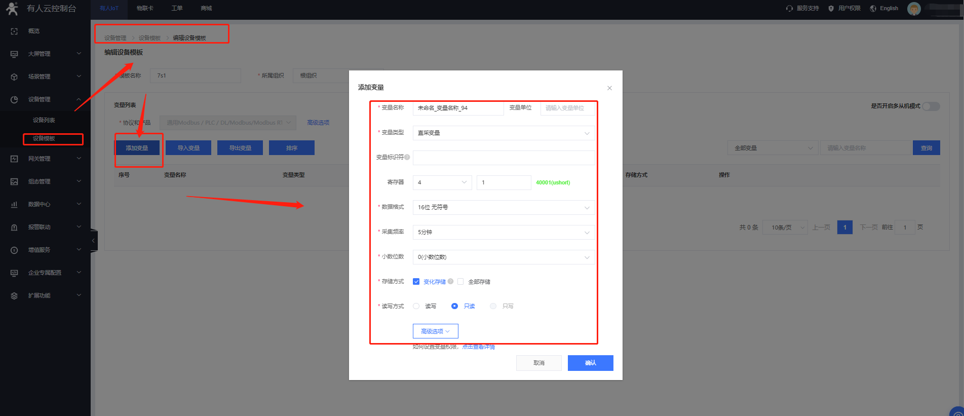 3、添加從機(jī)設(shè)備,關(guān)聯(lián)變量模板,7s1 支持modbus協(xié)議 云端輪詢(xún)方式。