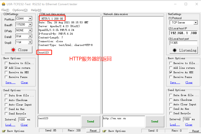 打開串口調試助手,通過串口發(fā)送test123,能夠收到http服務器的返回,因為在G806s上沒有勾選過濾頭信息,所以服務器返回的頭信息我們在串口也可以看到。