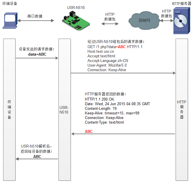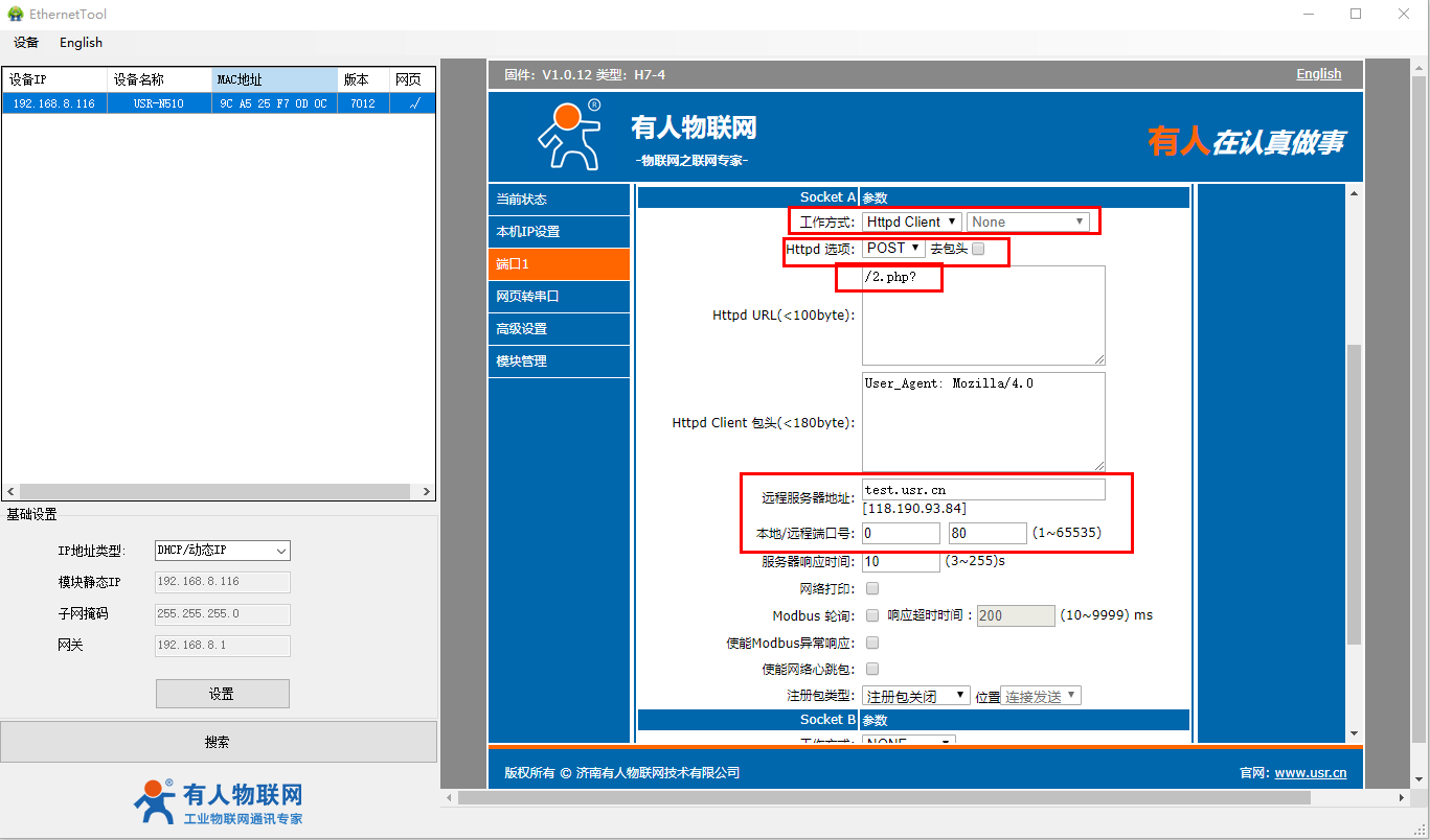 N510端口1工作方式設(shè)置HTTPD模式,POST,遠(yuǎn)程服務(wù)器地址填test.usr.cn,遠(yuǎn)程端口填80,本地端口號設(shè)置為0。URL填/2.php?,不濾除報頭。