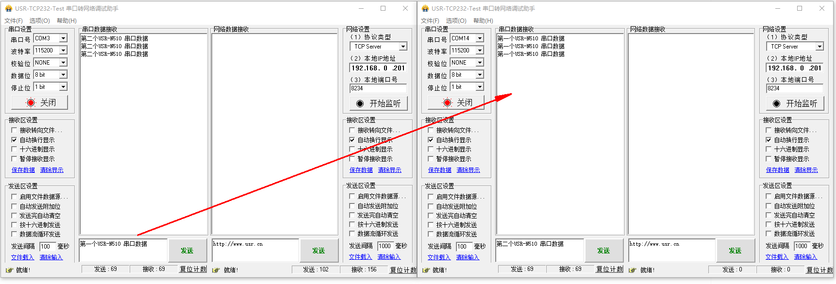 兩個N510的2個網(wǎng)口用一根網(wǎng)線直連,兩個N510的串口分別接USB-RS485串口線接電腦,打開2個串口助手,對應(yīng)各自N510串口參數(shù)。