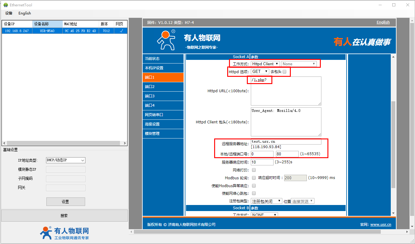 N540端口1工作方式設置HTTPD模式,GET,遠程服務器地址填test.usr.cn,遠程端口填80,本地端口號設置為0。URL填/1.php?,不濾除報頭。