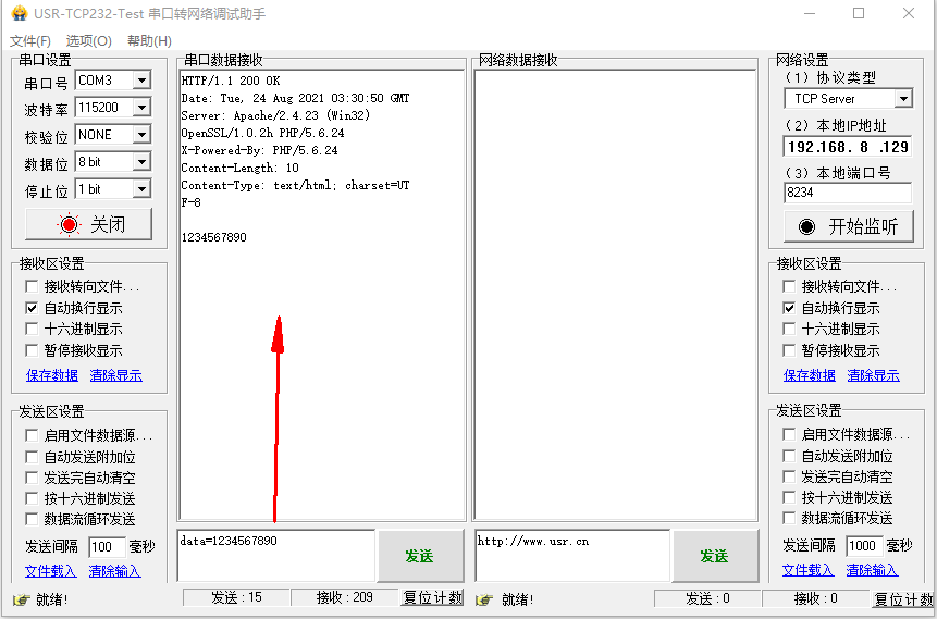 打開串口網(wǎng)絡助手,串口參數(shù)和N540 端口1參數(shù)保持一致,串口發(fā)送數(shù)據(jù)data=1234567890,測試服務器返回數(shù)據(jù)。