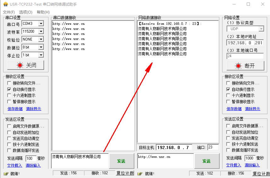 點擊連接,有連接對象之后,測試串口和網(wǎng)絡(luò)之間的數(shù)據(jù)傳輸。