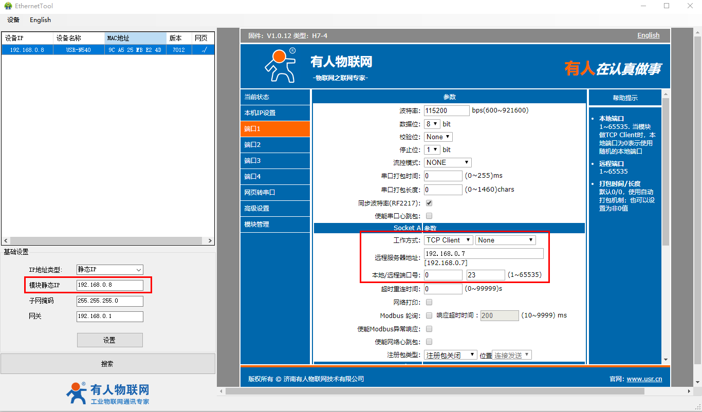 工作方式設置TCP client,遠程服務器地址填192.168.0.7,遠程端口填23。本地端口填0。