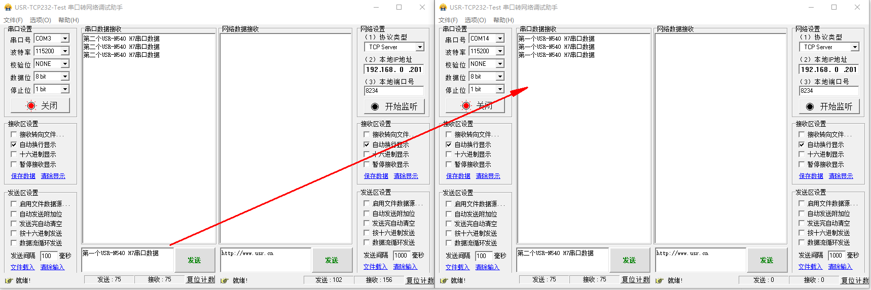 兩個N540的2個網(wǎng)口用一根網(wǎng)線直連,兩個N540的串口分別接USB-RS485串口線接電腦,打開2個串口助手,對應各自N540串口參數(shù)。