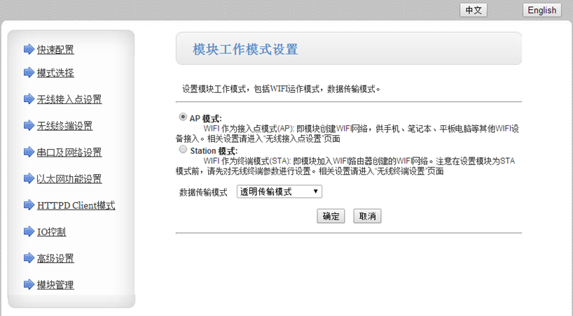 2:網頁設置支持兩種工作模式AP模式 STA模式。