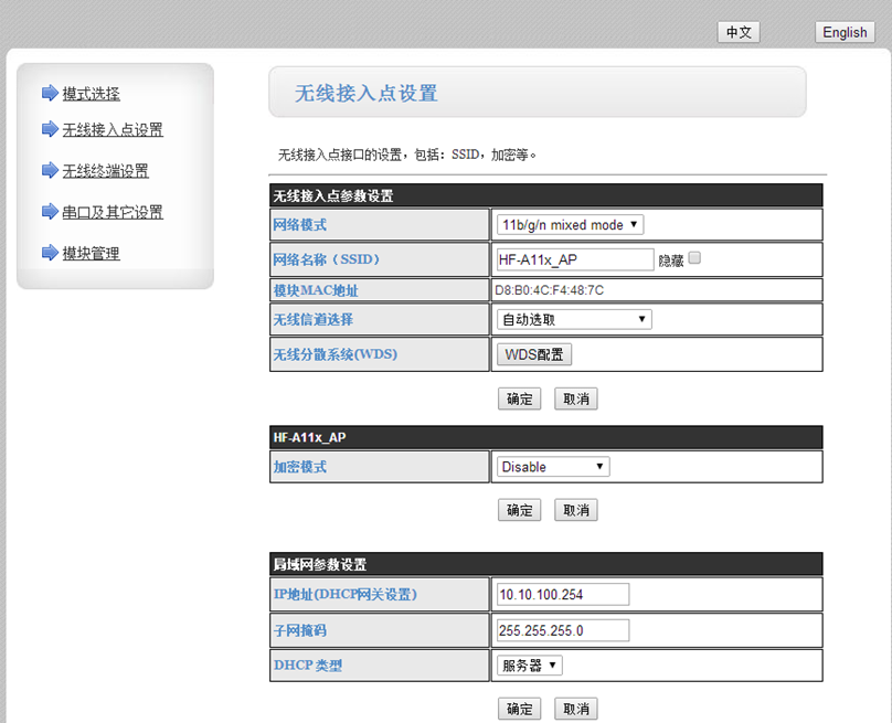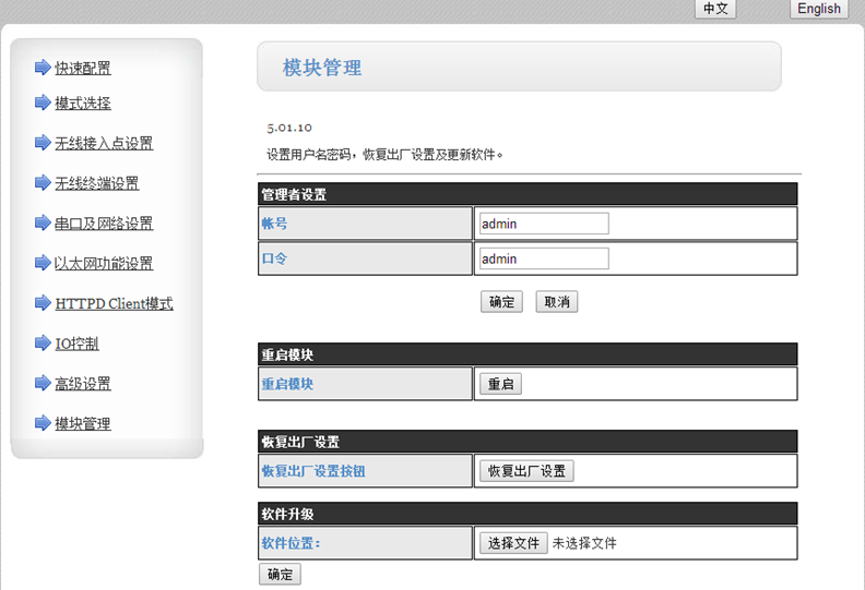 模塊在AP模式下默認IP是10.10.100.254.在瀏覽器上輸入此IP。用戶名和密碼都是admin。