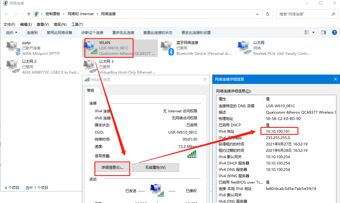2>連接W610的wifi,連接成功后,電腦會獲取到10.10.100.xx網(wǎng)段的IP地址