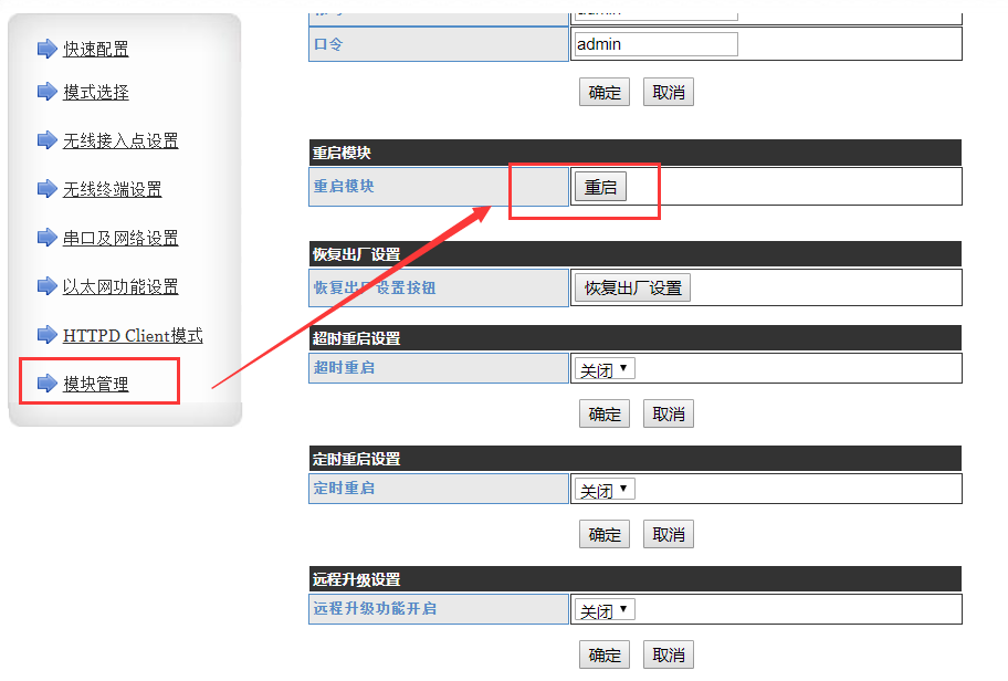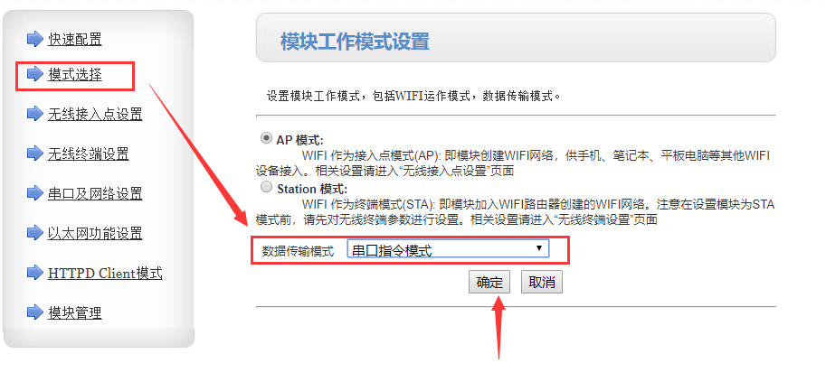 2、電腦瀏覽器地址欄輸入模塊默認(rèn)IP:10.10.100.254,賬號(hào)和密碼都是admin,進(jìn)入內(nèi)置網(wǎng)頁,模式選擇 -> 數(shù)據(jù)傳輸模式 -> 串口指令模式,點(diǎn)擊確定,串口及網(wǎng)絡(luò)設(shè)置 -> 網(wǎng)絡(luò)參數(shù)設(shè)置 -> 網(wǎng)絡(luò)模式配置為client,點(diǎn)擊確定,重啟模塊。