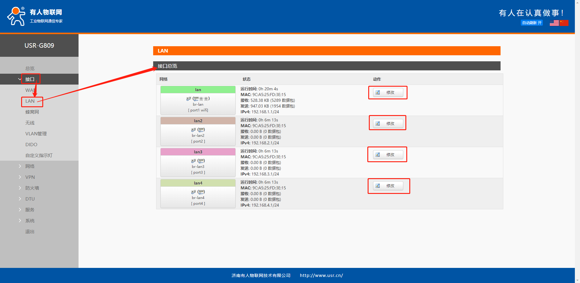 8、點擊對應接口后方的修改,即可修改該接口的網(wǎng)段。要注意,若設備WAN口(包括WAN_4G和WAN_WIRED)已有IP,則LAN口(包括LAN1-4)IP不能與WAN口一致。參數(shù)全部修改完成后點擊下方保存并應用。此處以LAN接口為例進行設置,其余幾個LAN口設置方式一致