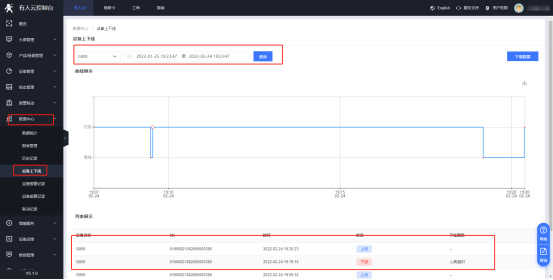 (4)在“數(shù)據(jù)中心”--“設(shè)備上下線”界面中可以查看相應(yīng)設(shè)備的上下線記錄,同時(shí)數(shù)據(jù)支持下載成EXCEL表格保存至本地