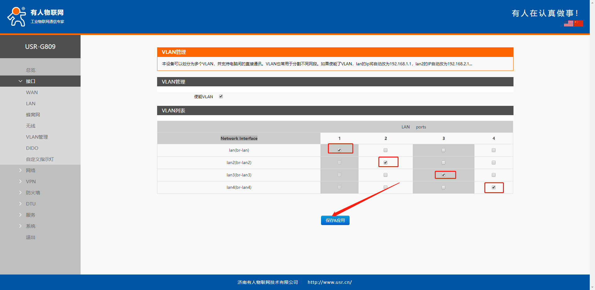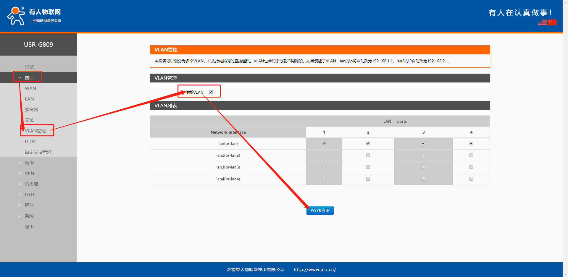 3、進(jìn)入接口-VLAN管理界面,使能VLAN,勾選上則為開(kāi)啟此功能,保存并應(yīng)用開(kāi)啟