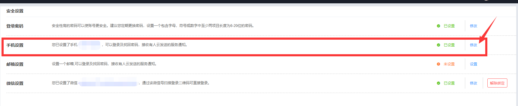 3、在安全設(shè)置界面找到 手機(jī)設(shè)置 一欄,點(diǎn)擊后面修改