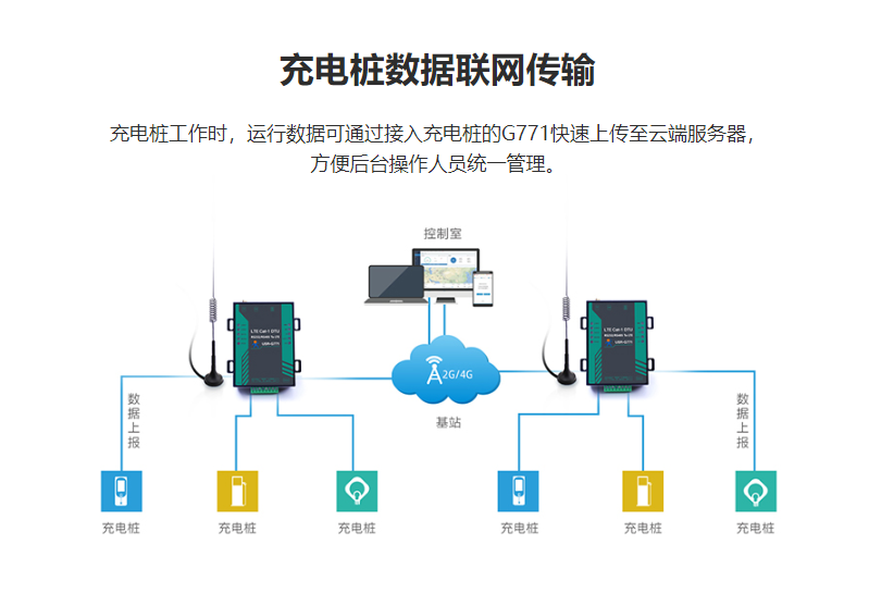 充電樁工作時,運行數(shù)據(jù)可通過接入充電樁的G771快速上傳至云端服務器,方便后臺操作人員統(tǒng)一管理