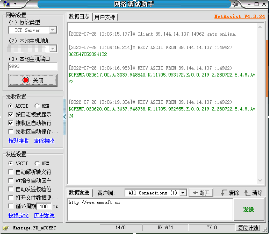 四、網(wǎng)絡(luò)調(diào)試助手點擊打開。因為設(shè)置了注冊包類型為IMEI且與服務器連接時發(fā)送一次注冊包,所以可以看到第一次連接是給服務器發(fā)送IMEI,之后三秒上報一次數(shù)據(jù)。