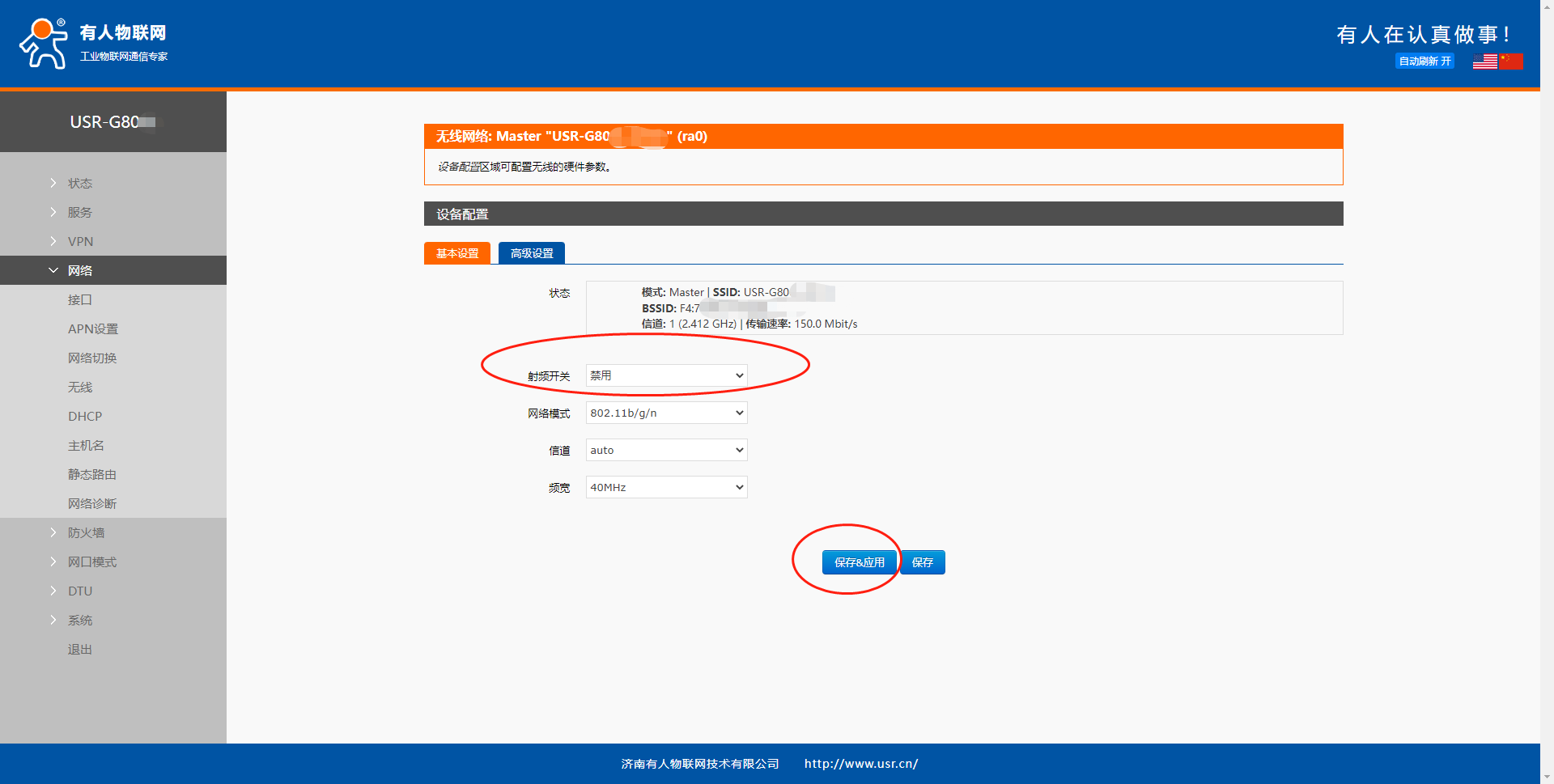 G80x(包括G806、G806s等)系列:網(wǎng)絡(luò)--無(wú)線--高級(jí)設(shè)置--禁用射頻開(kāi)關(guān)--保存&應(yīng)用