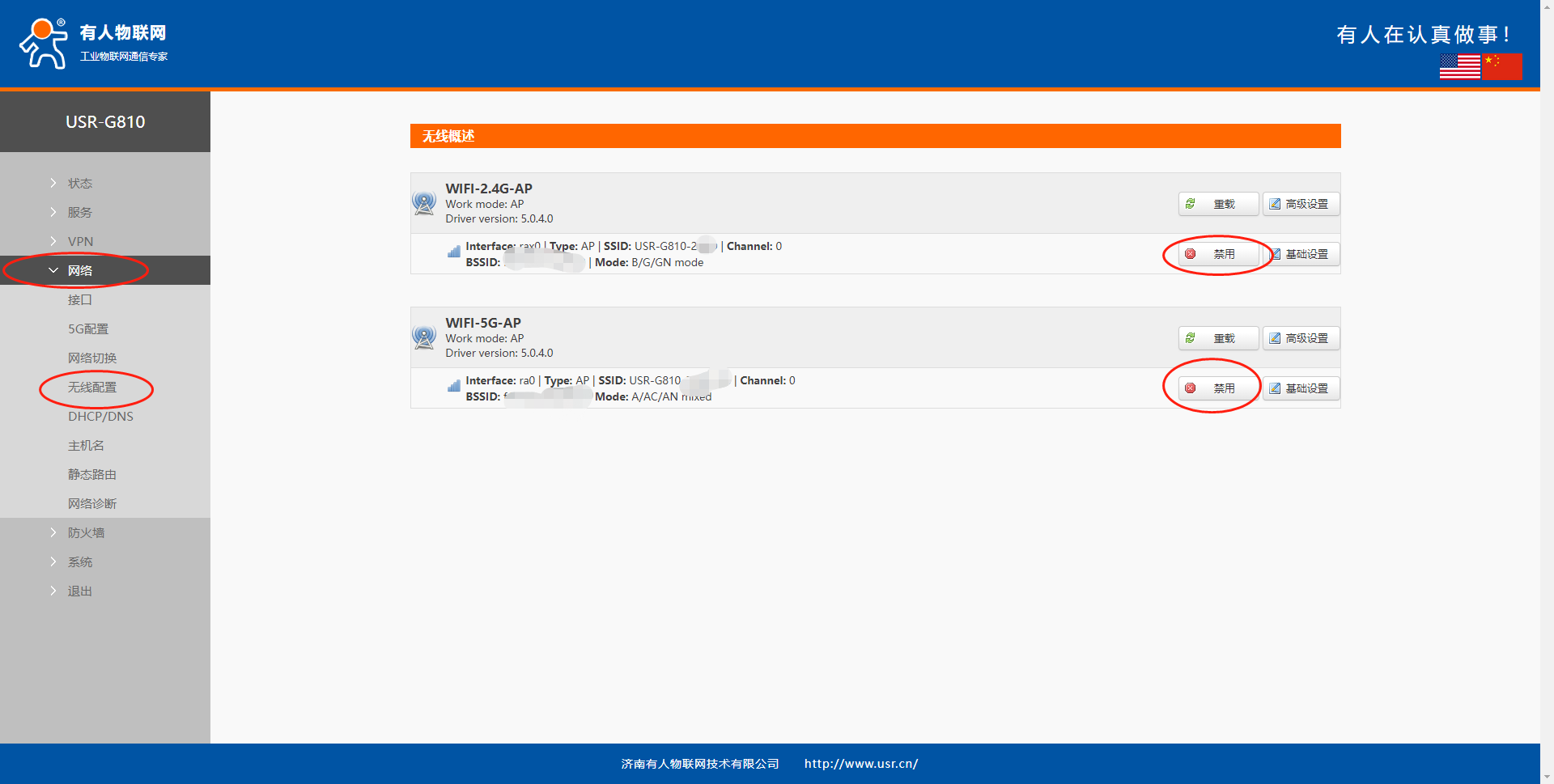 G817、G816w:網(wǎng)絡(luò)--無(wú)線--2.4G配置/5.8G配置--啟用(取消勾選)--應(yīng)用