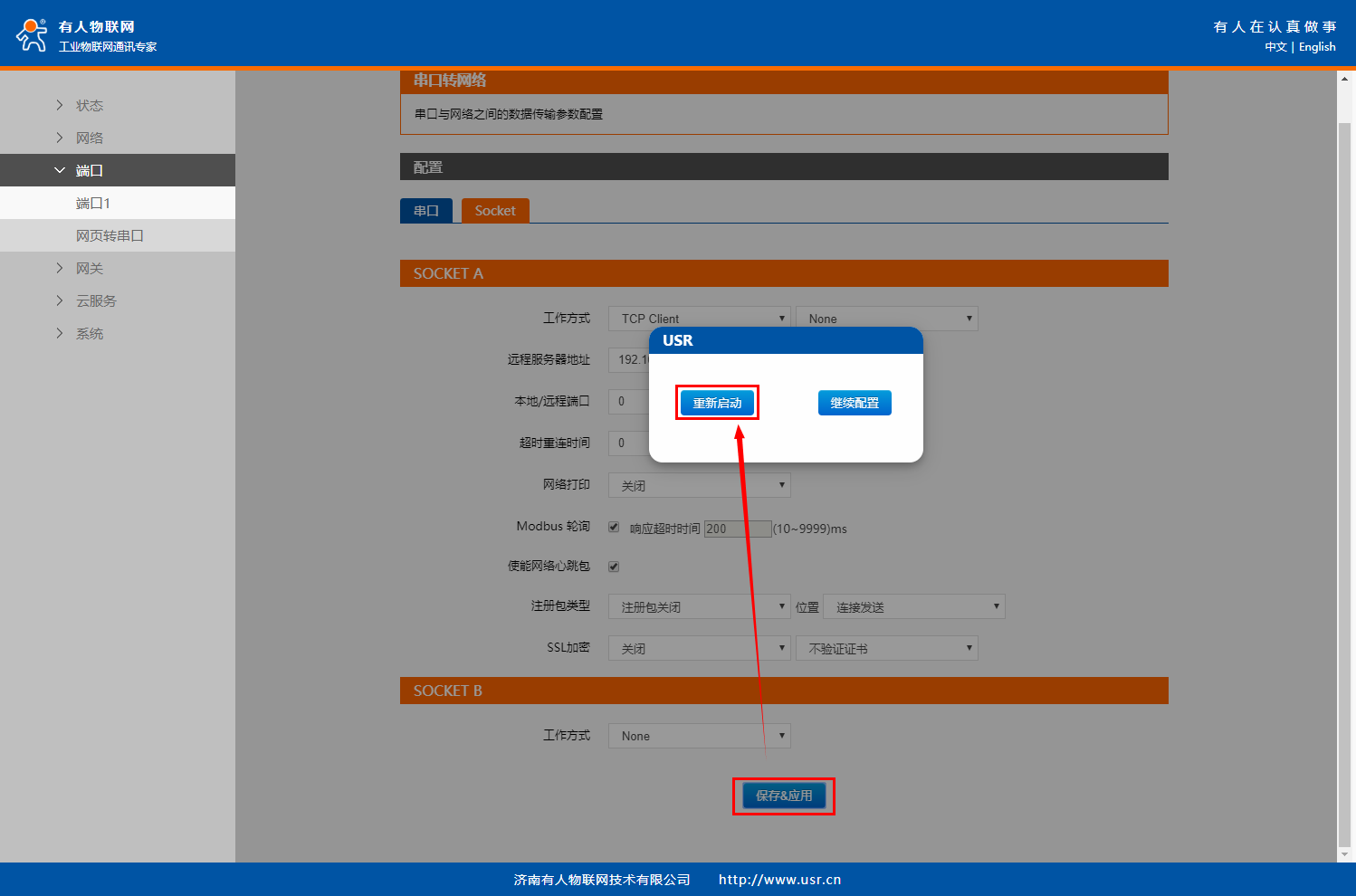 在“端口”>“端口1”界面中的“Socet”配置Socket A的工作模式為“TCP Client”