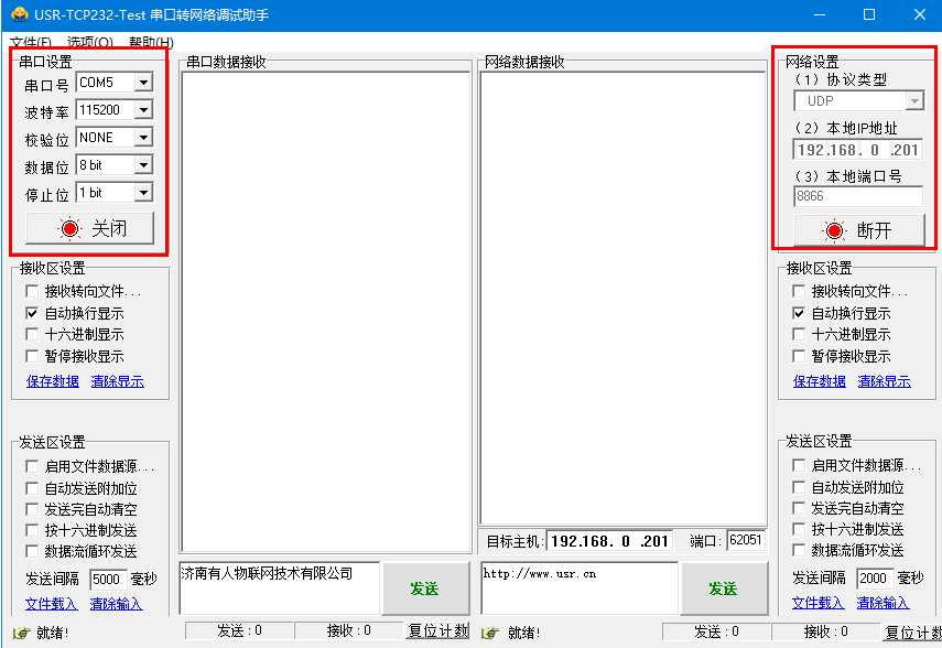 網(wǎng)絡(luò)協(xié)議配置為UDP server,本地IP地址為192.168.0.201,本地端口號自定義設(shè)置(8866),點擊開啟監(jiān)聽,打開真實串口COM5。