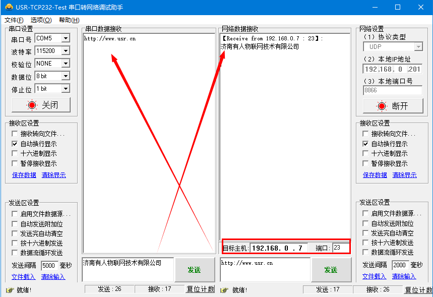 10、N510重啟后,串口發(fā)送數(shù)據(jù),網(wǎng)絡(luò)端便可接收數(shù)據(jù),網(wǎng)絡(luò)對192.168.0.7,端口23發(fā)送數(shù)據(jù),N510串口可透傳輸出。