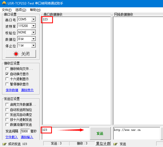 11、N510用485轉(zhuǎn)usb串口線接電腦,用串口調(diào)試助手打開,串口發(fā)送123,服務(wù)器回復(fù)123。