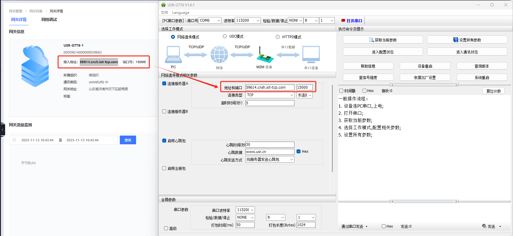 6、有人云打開網(wǎng)關(guān)管理--網(wǎng)關(guān)列表--點(diǎn)“USR-G776-1”的名稱,跳轉(zhuǎn)到網(wǎng)關(guān)詳情頁面,配置軟件上工作模式選擇網(wǎng)絡(luò)透傳模式,服務(wù)器A填寫有人云平臺(tái)的接入地址和端口