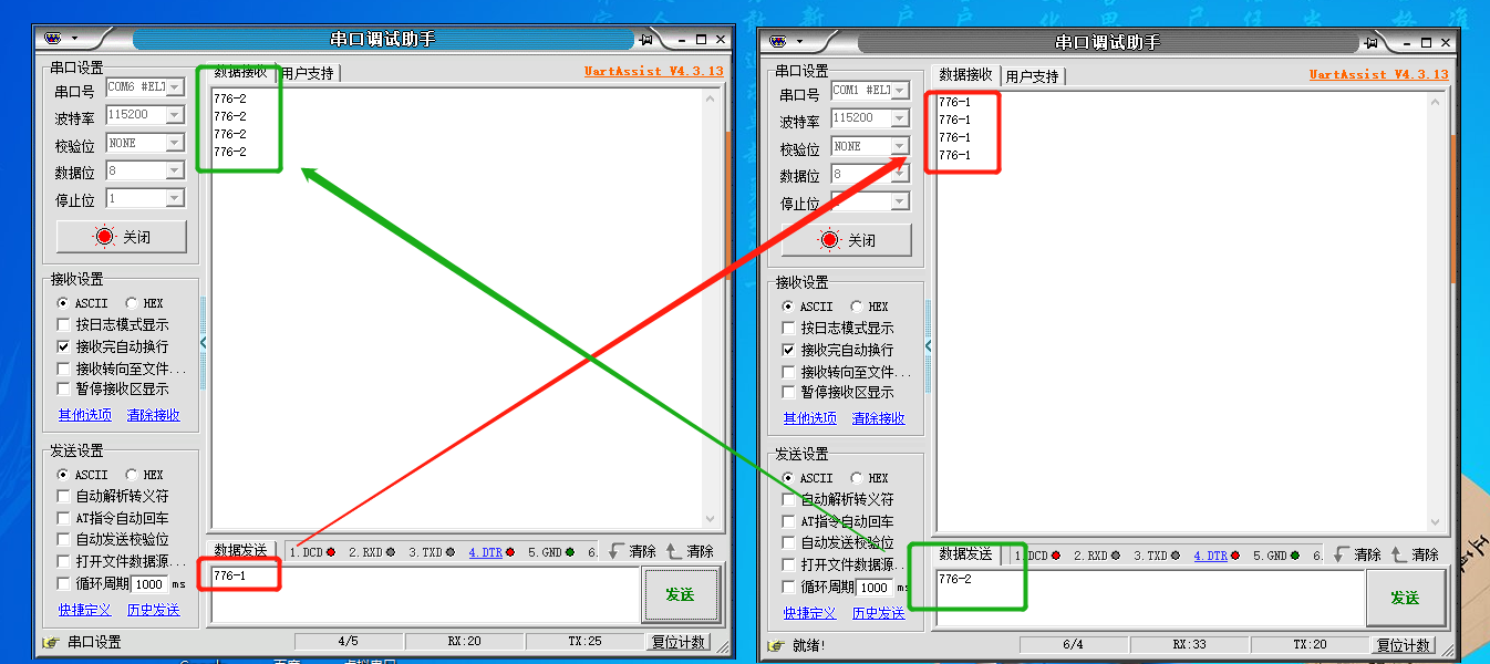 10、打開兩個(gè)串口調(diào)試助手軟件,選擇正確的串口以及串口參數(shù),分別打開設(shè)備插在電腦上識(shí)別到的COM口,具體數(shù)據(jù)測(cè)試截圖如下: