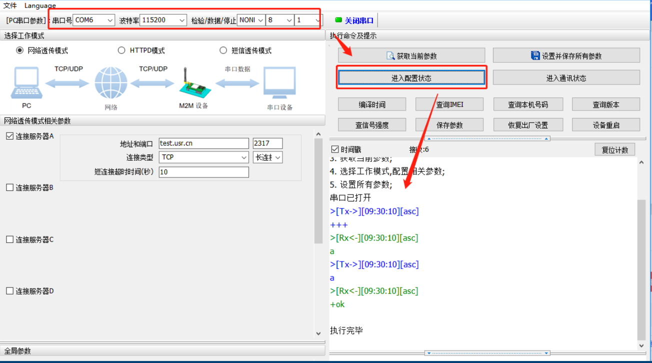 5、打開776設(shè)置軟件,PC串口參數(shù)選擇設(shè)備此時(shí)的串口參數(shù),默認(rèn)是115200,N,8,1。如果之前有配置過其他參數(shù),比如波特率配置成了9600,再此處就要選擇9600,N,8,1進(jìn)入配置狀態(tài)。返回OK代表正確進(jìn)入配置狀態(tài)。