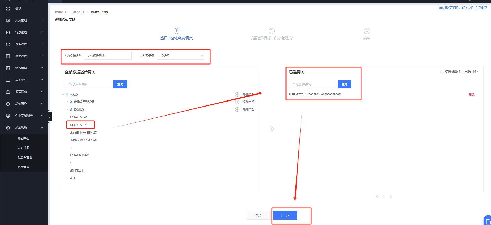 設(shè)置透傳名稱,選擇組織,選擇邊緣端網(wǎng)關(guān)