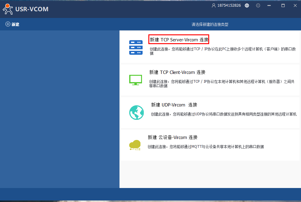 電腦下載的虛擬串口軟件,新建TCP-Server-Vircom連接,添加一個虛擬串口COM1。本地端口填50。