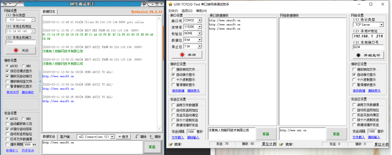 7、打開串口,串口參數(shù)和N520的串口參數(shù)保持一致,網(wǎng)絡(luò)端點(diǎn)擊鏈接,如下圖有連接對(duì)象顯示,網(wǎng)絡(luò)端和串口端互發(fā)數(shù)據(jù)測(cè)試。